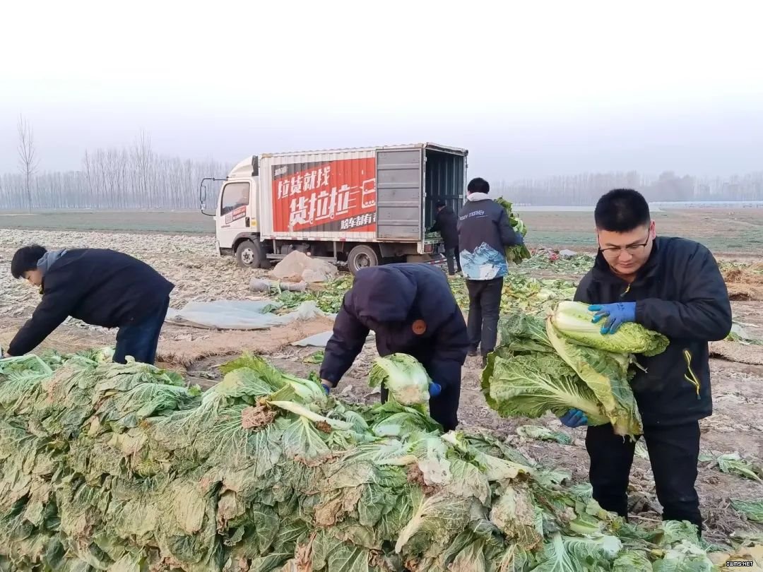为保障捐赠白菜的新鲜,新明起航员工顶着寒风,早上5点多出发到白菜地里装运白菜。