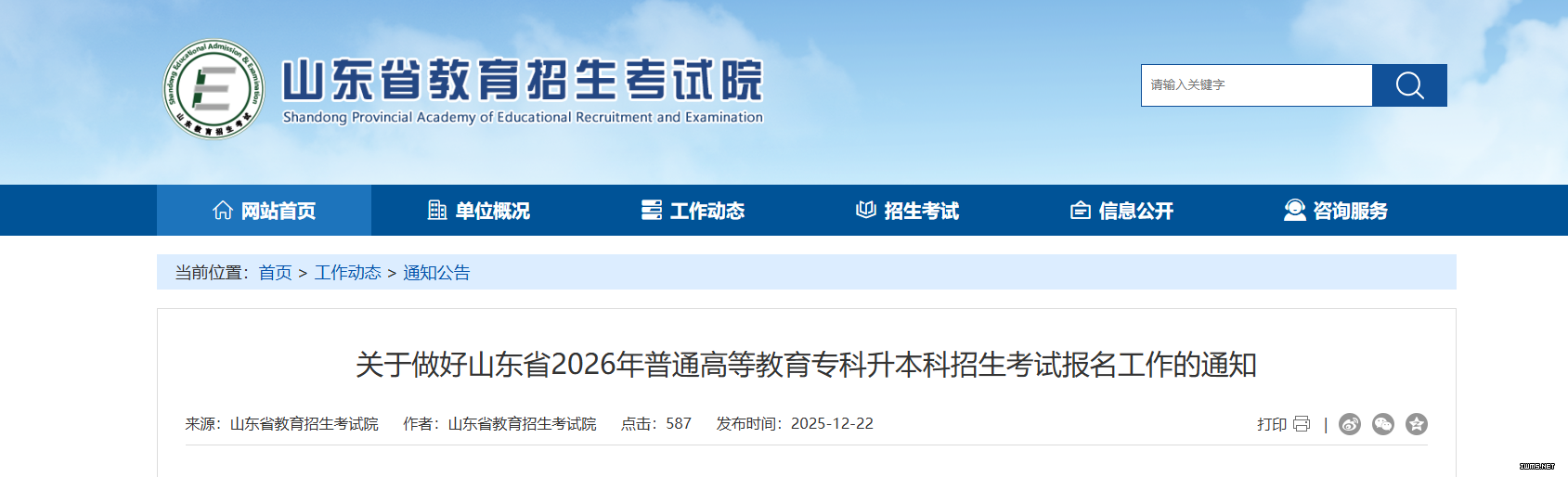 根据《山东省教育厅 山东省人民政府征兵办公室 山东省退役军人事务厅关于做好2026年普通高等教育专科升本科考试招生工作的通知》(鲁教学函〔2025〕24号)(以下简称《通知》),现将我省2026年普通高等教育专科升本科(以下简称普通专升本)招生考试报名工作有关事项通知如下:
