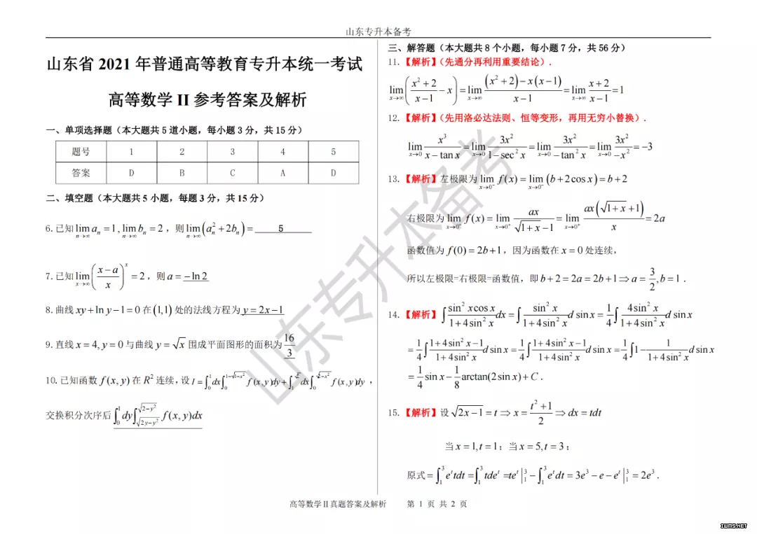 2021年山东省专升本高等数学Ⅱ真题及参考答案