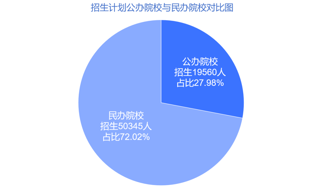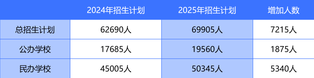 2025年山东专升本考试校荐生招生计划数为69905人,相较于2024年校荐生招生计划扩招7215人,其中:公办学校招生19560人,比2024年增加了1875人;民办学校招生50345人,比2024年增加了5340人。