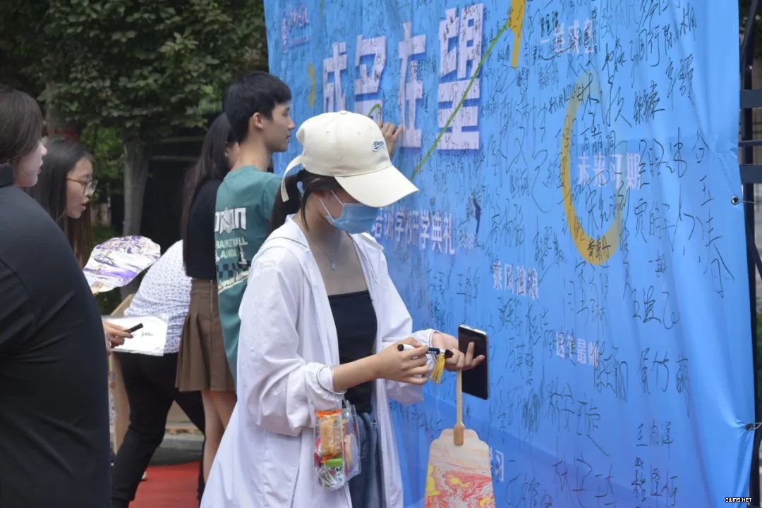 一面巨大的签名墙矗立在教学楼下方,宛如一面承载着梦想与希望的画卷。同学们排着长队,每个人的眼中都闪烁着兴奋与期待的光芒。手中紧握的笔,仿佛握住了通往未来的钥匙。