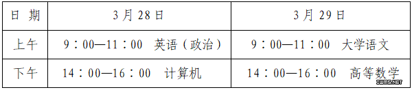 统考科目为4门公共基础课,包括英语(专科期间公共外语课程为非英语的考政治)、计算机、大学语文、高等数学(分为高等数学Ⅰ、高等数学Ⅱ、高等数学Ⅲ),具体考试科目设置情况见附件4。每门科目考试时间120分钟、满分100分,总分满分400分。省教育招生考试院负责统一命题,统一考试,统一评卷。各科考试时间安排如下: